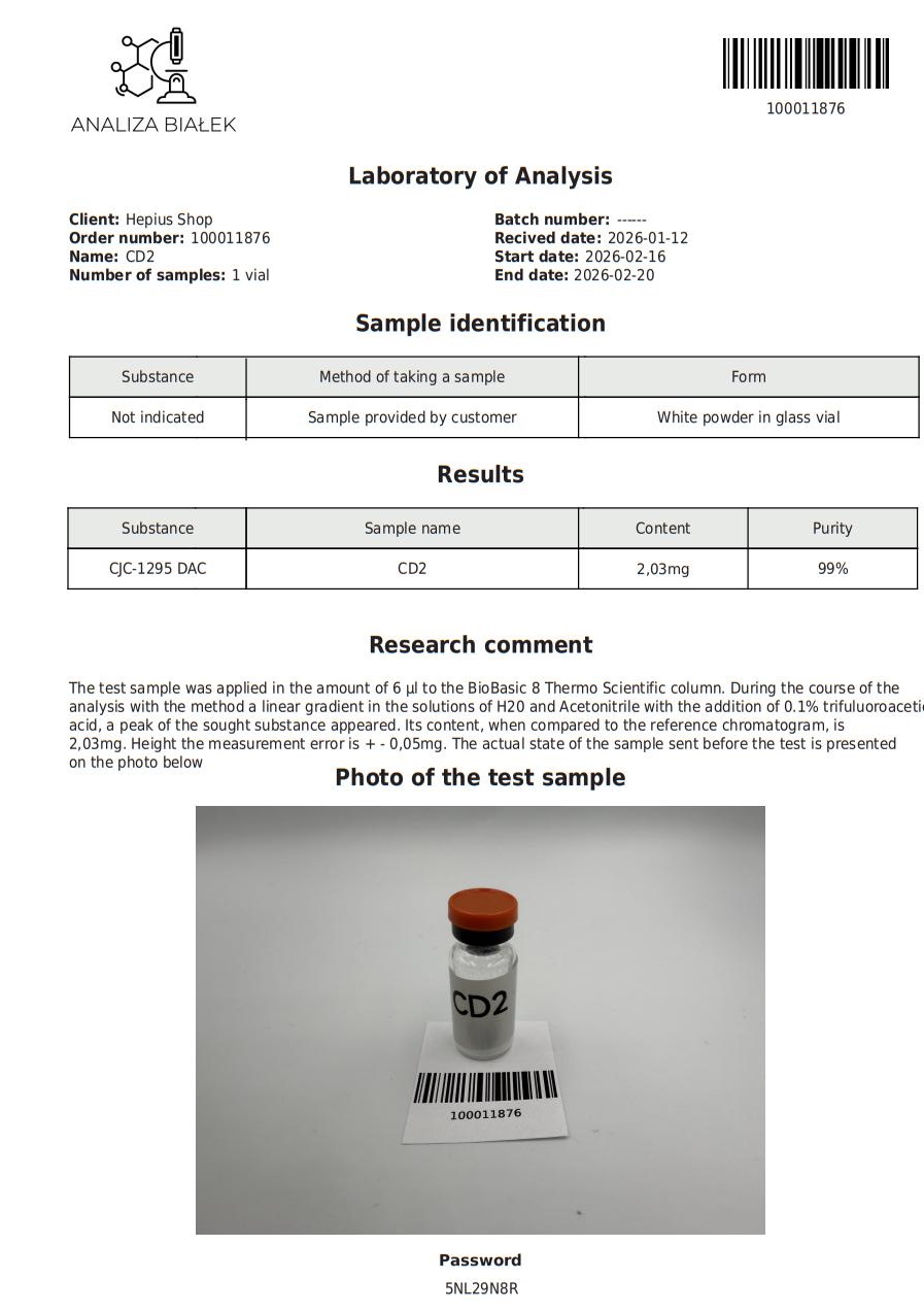 The DAC (Drug Affinity Complex) in CJC-1295 with DAC makes this version of the peptide long-acting by extending its half-life. It still stimulates the GHRH receptor but with less frequent injections compared to regular CJC-1295. Increases growth hormone release in a sustained manner, leading to improved muscle recovery, fat loss, and enhanced tissue repair.
