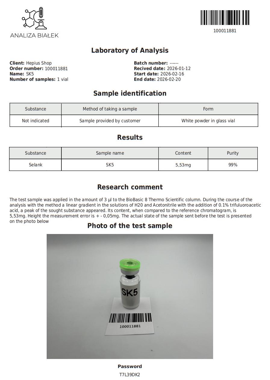 Selank is a synthetic peptide with nootropic and anxiolytic properties. It works by modulating the serotonin and dopamine systems in the brain to reduce anxiety, improve cognitive function, and enhance mental clarity. It has potential applications for stress relief, social anxiety, memory improvement, and mood enhancement. Selank is generally well-tolerated, but it should be used with caution, especially considering its status as a research chemical and the limited approval for medical use in some countries. Always consult a healthcare provider before considering the use of Selank.